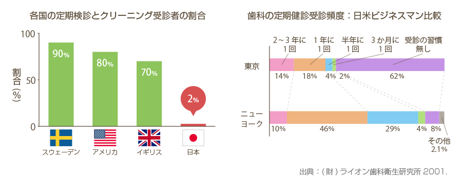 歯周病はむし歯のようにはっきりとした痛みはなく、気づかないうちに進行しやすい病気です。日本では成人の約8割が罹患していると言われ、さらに歯を失う原因の第1位が歯周病とされています。にもかかわらず、歯周病の予防や進行・悪化の防止に欠かせない定期検診を受けている方はまだまだ少ないのが現状です。
