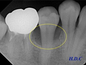 左下のレントゲンが初診時、右下のレントゲンがエムドゲイン治療後2年経過時です。